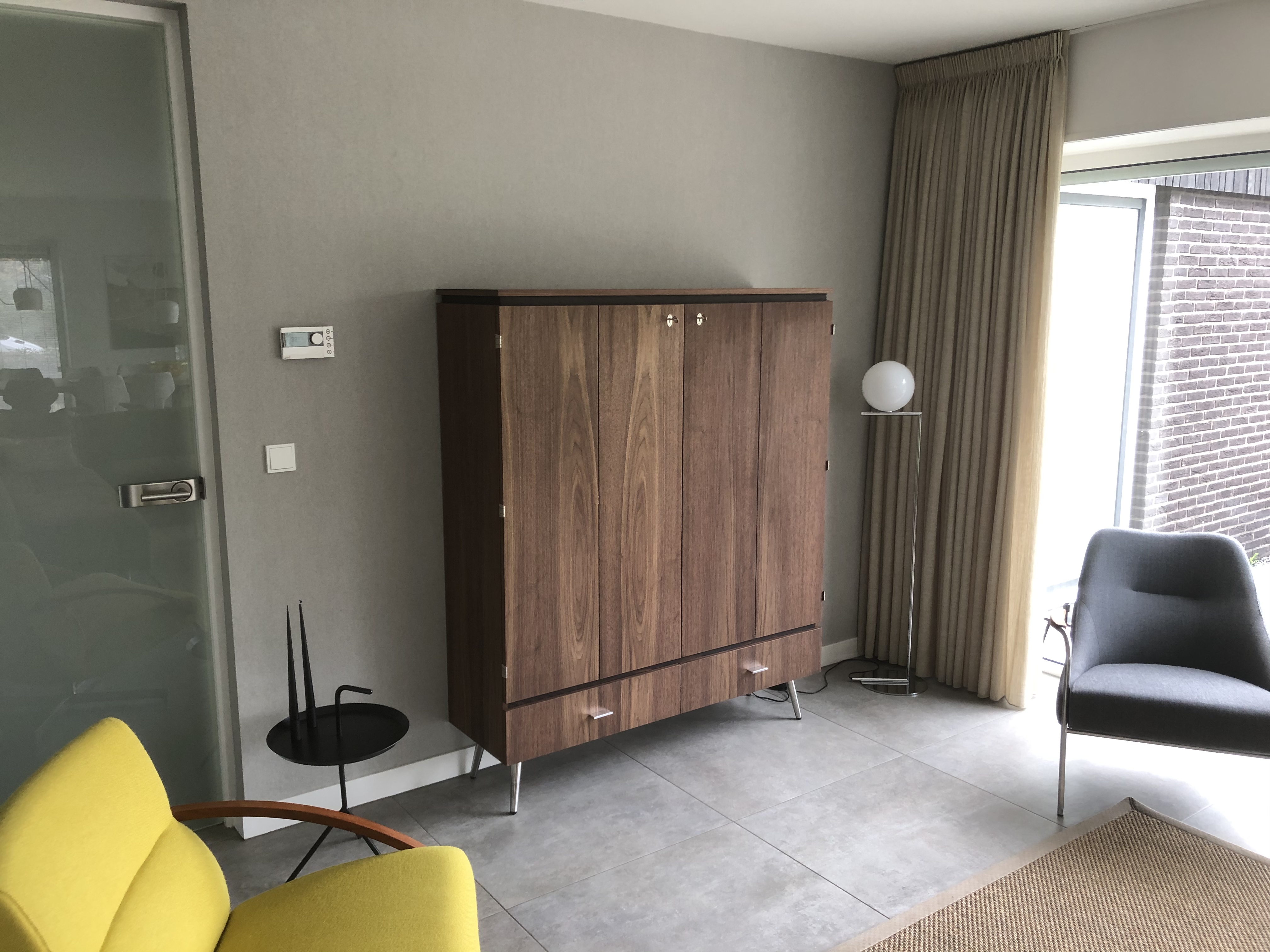 Om de vintage-stijl van het meubel te benadrukken is er gekozen voor Walnoten fineer.