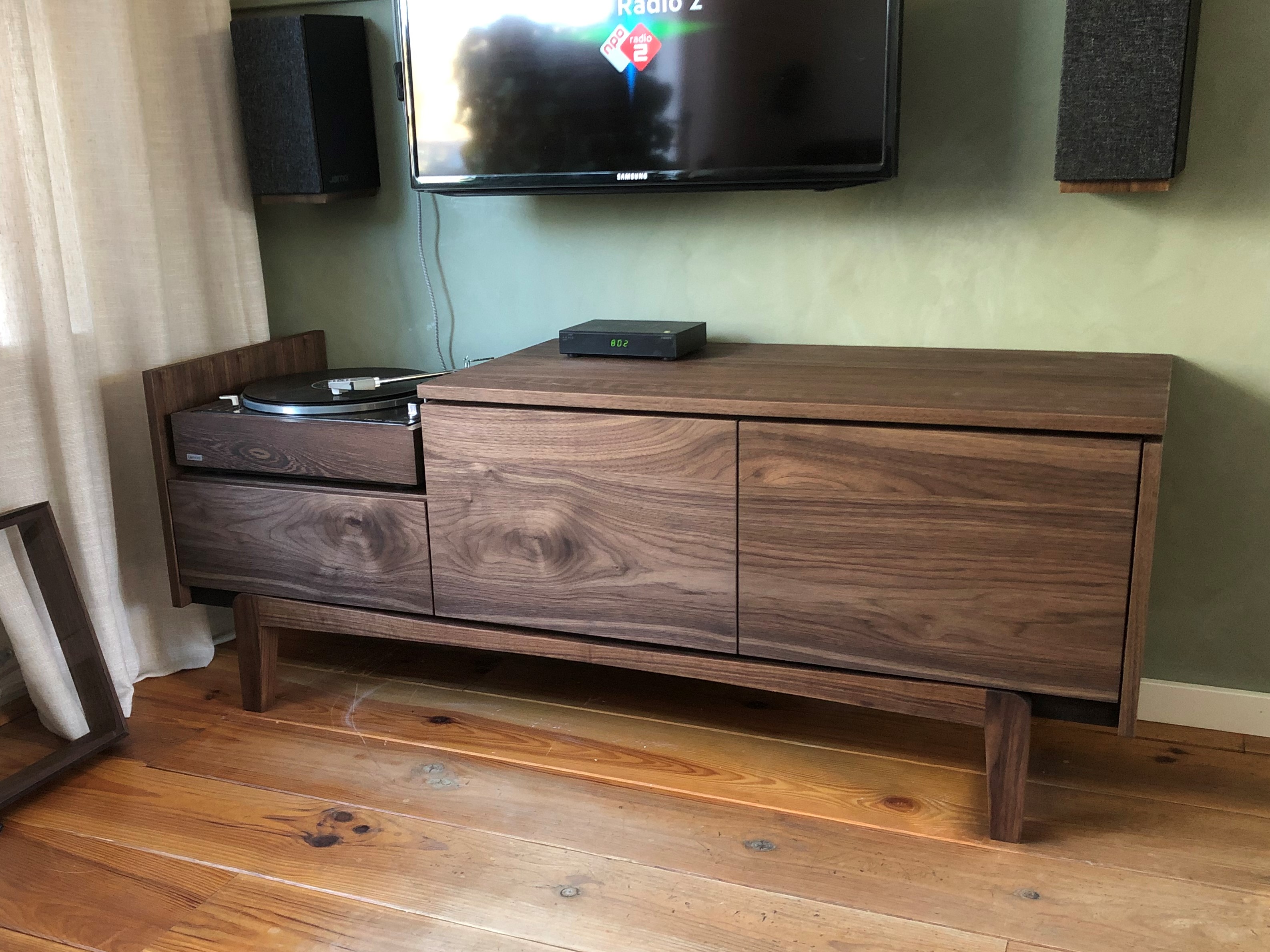 Om de rustige lijnen te behouden heb ik ervoor gekozen om de platenspeler te verzinken in het meubel. Een moderne twist is toegevoegd door de laden te laten openen met een push-to-open systeem, en soft-close te laten sluiten.