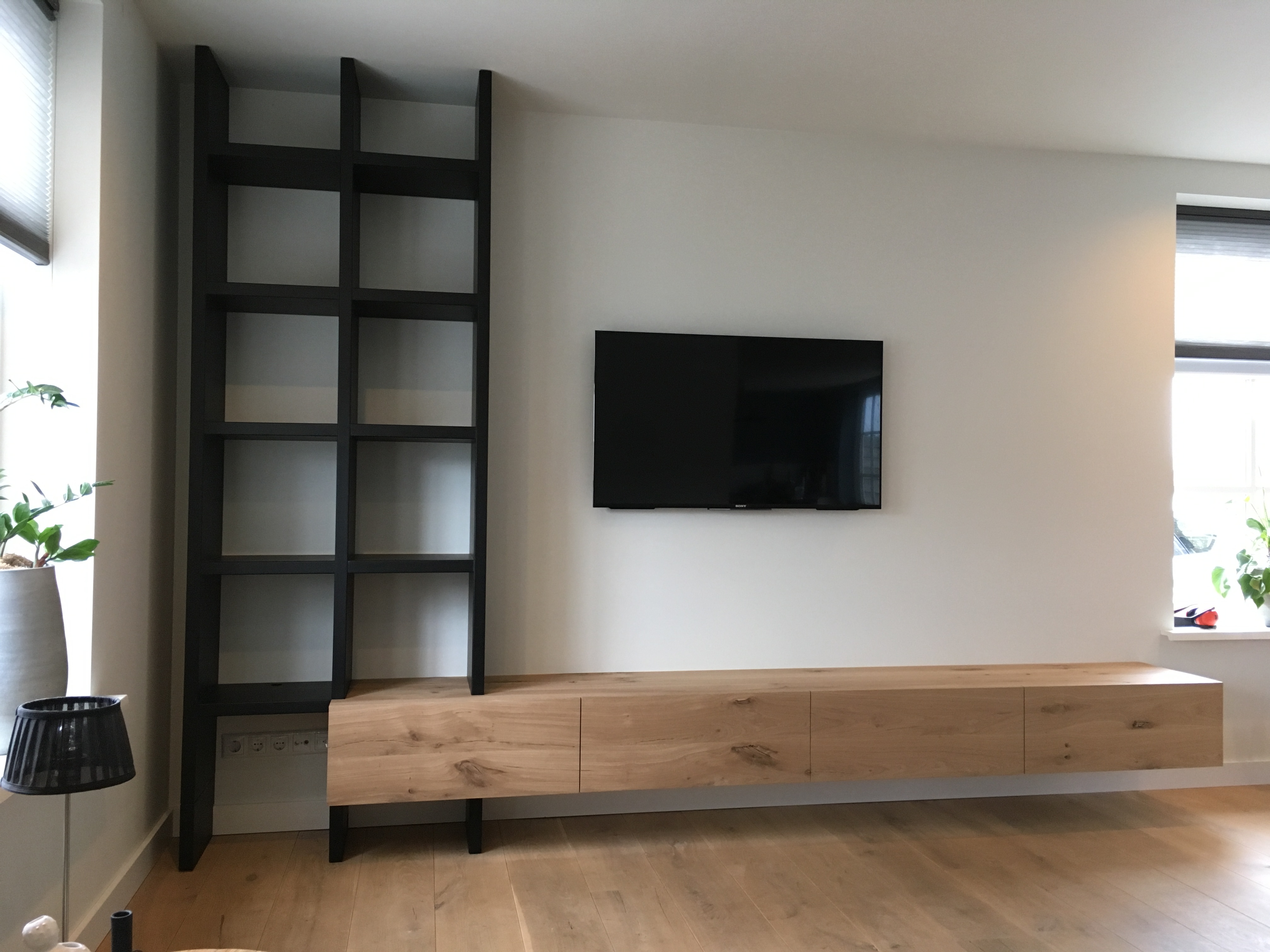 Deze klant had de wens om een Tv-meubel te laten maken in vintage stijl, waarin zijn platenspeler goed tot zijn recht kwam.